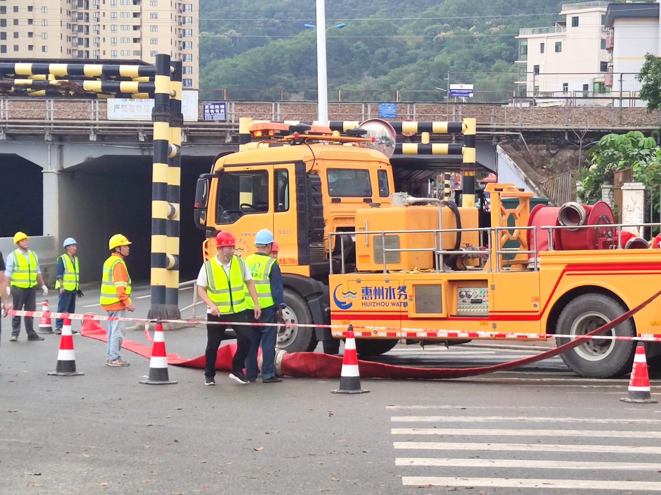此次演練以惠城區(qū)遭遇特大暴雨為背景,模擬銀嶺路、麗楓酒店、火車西站三孔橋下等多處易澇點(diǎn)出現(xiàn)嚴(yán)重積水,市水務(wù)集團(tuán)排水管理中心緊急啟動(dòng)應(yīng)急救援的場景。根據(jù)應(yīng)急預(yù)案,市水務(wù)集團(tuán)排水管理中心組織開展了預(yù)警信息上報(bào)、人員調(diào)度、開井蓋排水、排水搶險(xiǎn)車(“龍吸水”)抽水、管道清疏、交通疏導(dǎo)等多個(gè)內(nèi)容的實(shí)戰(zhàn)演練。